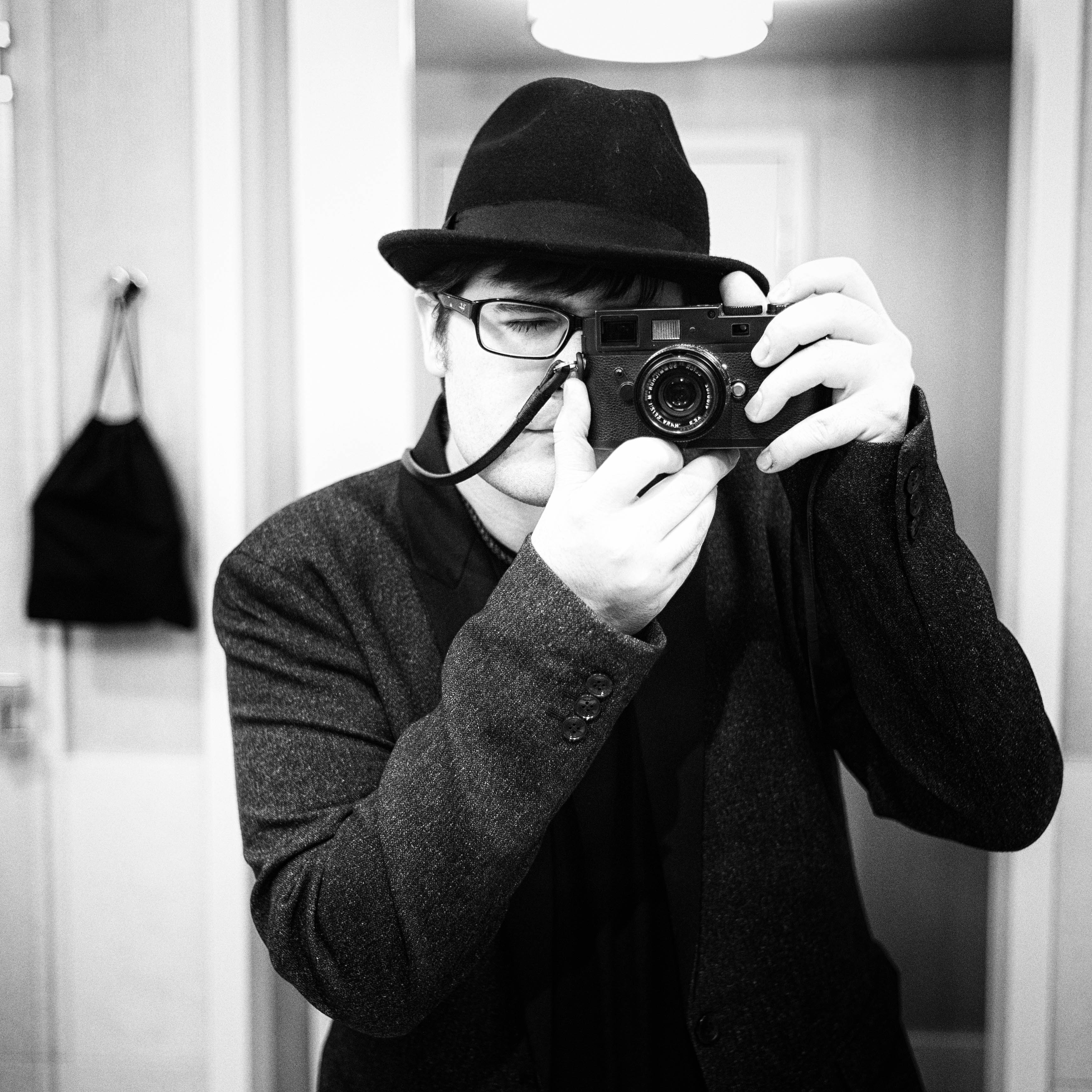 In a dimly lit bathroom, a young man captures his own reflection through a vintage camera, embodying the spirit of an artist. Dressed in a stylish hat and an elegant blazer, the composition radiates a blend of contemplation and creativity. The monochrome palette accentuates the intimate mood, drawing focus to both the subject and his passion for photography.