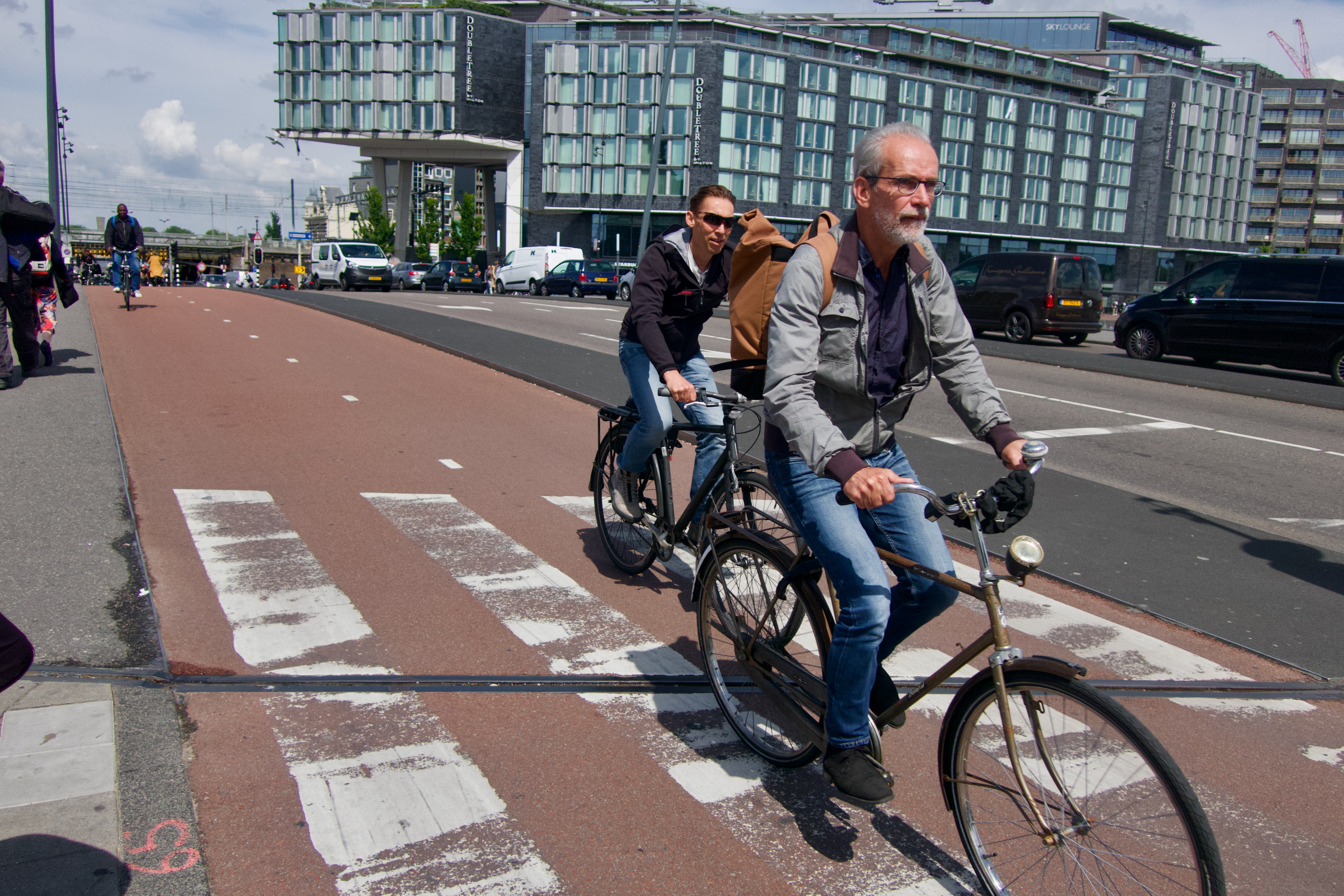 This photograph captures two cyclists navigating a wide bike lane in a vibrant urban setting, with modern architecture in the background. The bright light of day casts soft shadows, creating a lively and dynamic atmosphere, while the cyclists’ focused expressions convey a sense of purpose. The composition emphasizes the contrast between the cyclists and the surrounding cars, highlighting the blend of city life and eco-friendly transport.