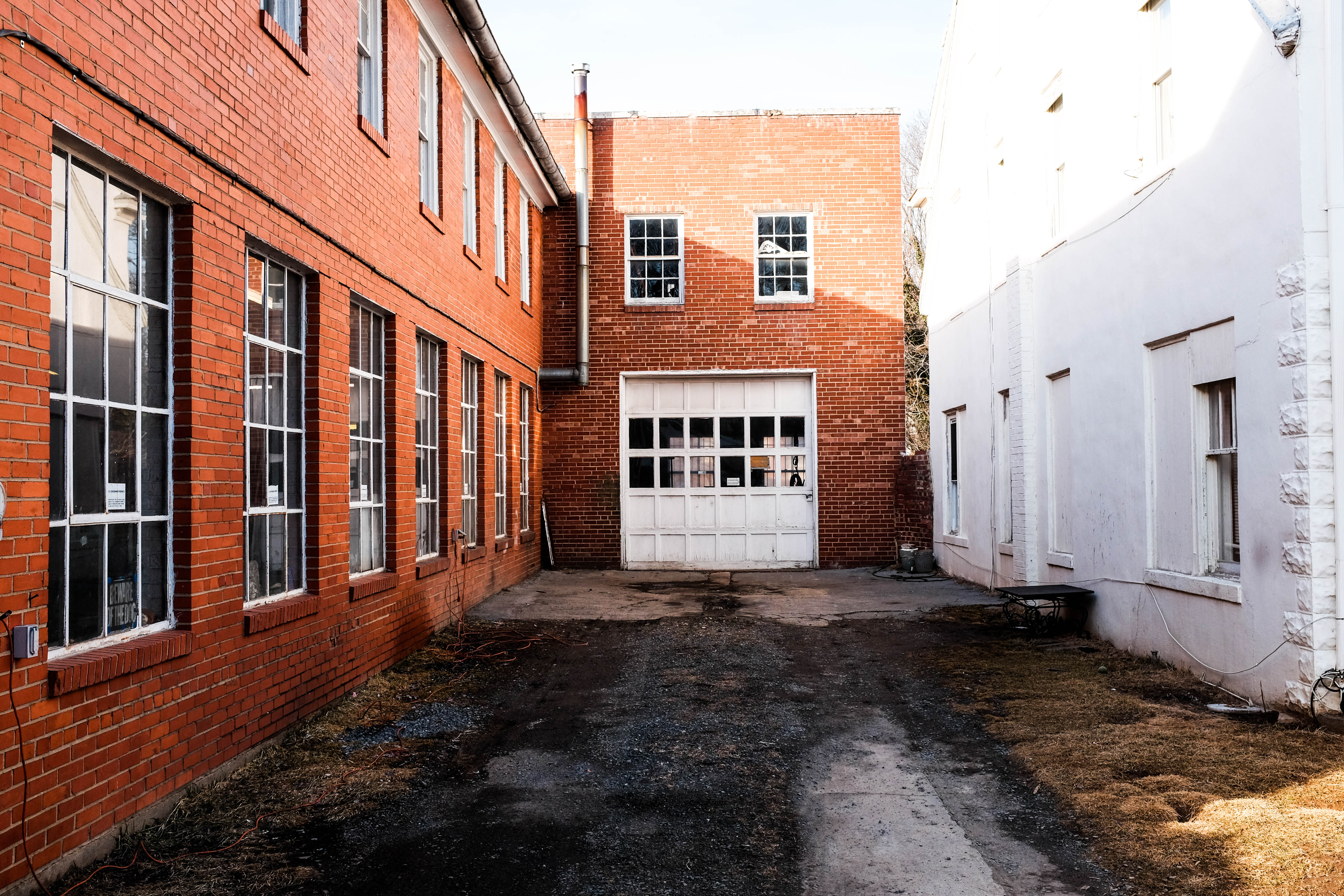 This photograph captures a narrow alleyway flanked by two distinct buildings, one of red brick and the other an off-white hue, creating a striking contrast. The low winter sunlight casts long shadows, enhancing the sense of isolation and stillness in this urban space. The clean lines and geometric shapes draw the eye toward the central garage door, inviting curiosity about the life behind its closed facade.