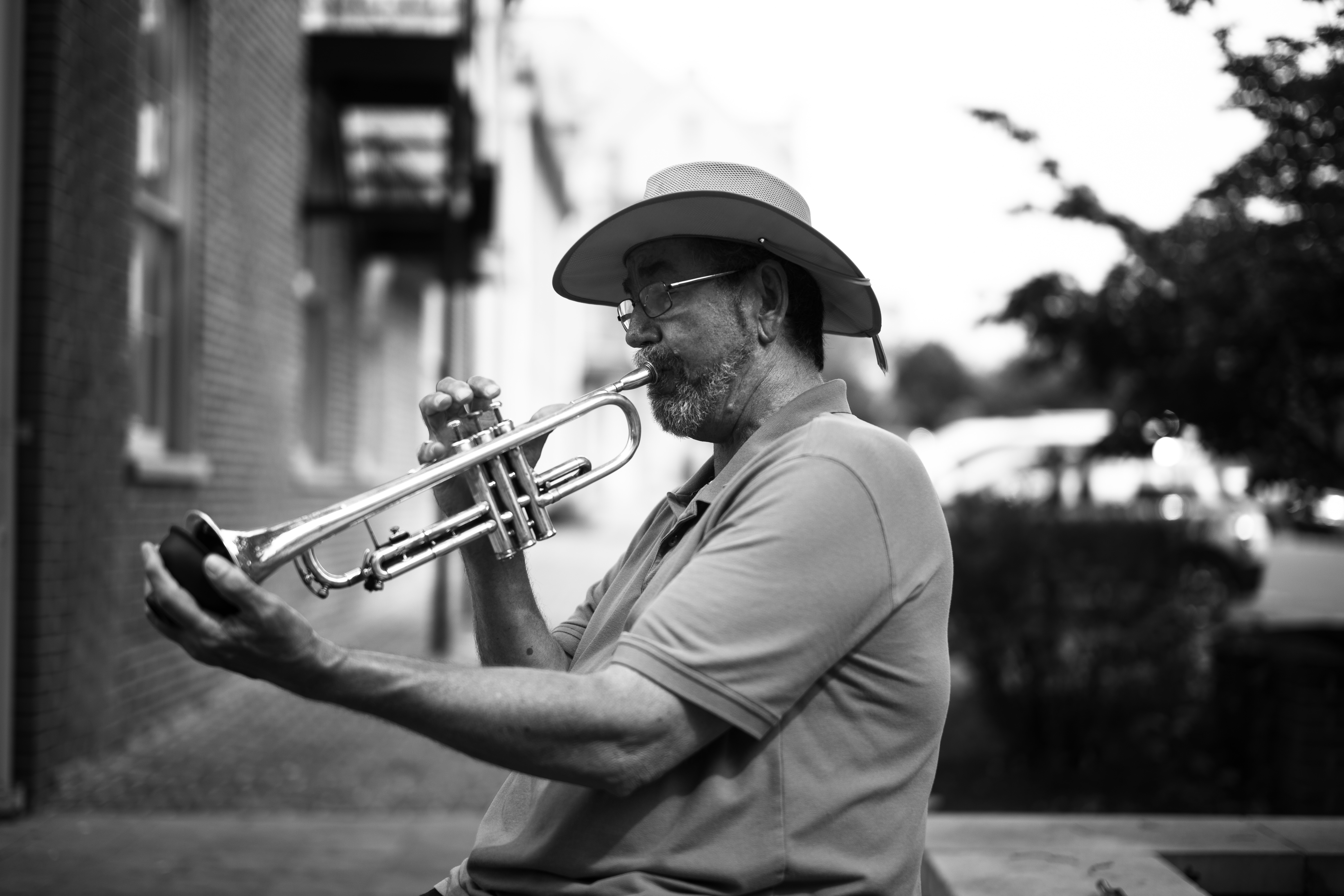 In this striking black-and-white photograph, an elderly man plays the trumpet, his expression reflecting a deep concentration and joy in music. The soft lighting casts gentle shadows, enhancing the textures of his weathered face and the gleaming instrument, while the blurred urban background adds a feeling of intimacy to the moment. The composition draws the eye to his skillful hands and the instrument, embodying the soulful connection between musician and music.