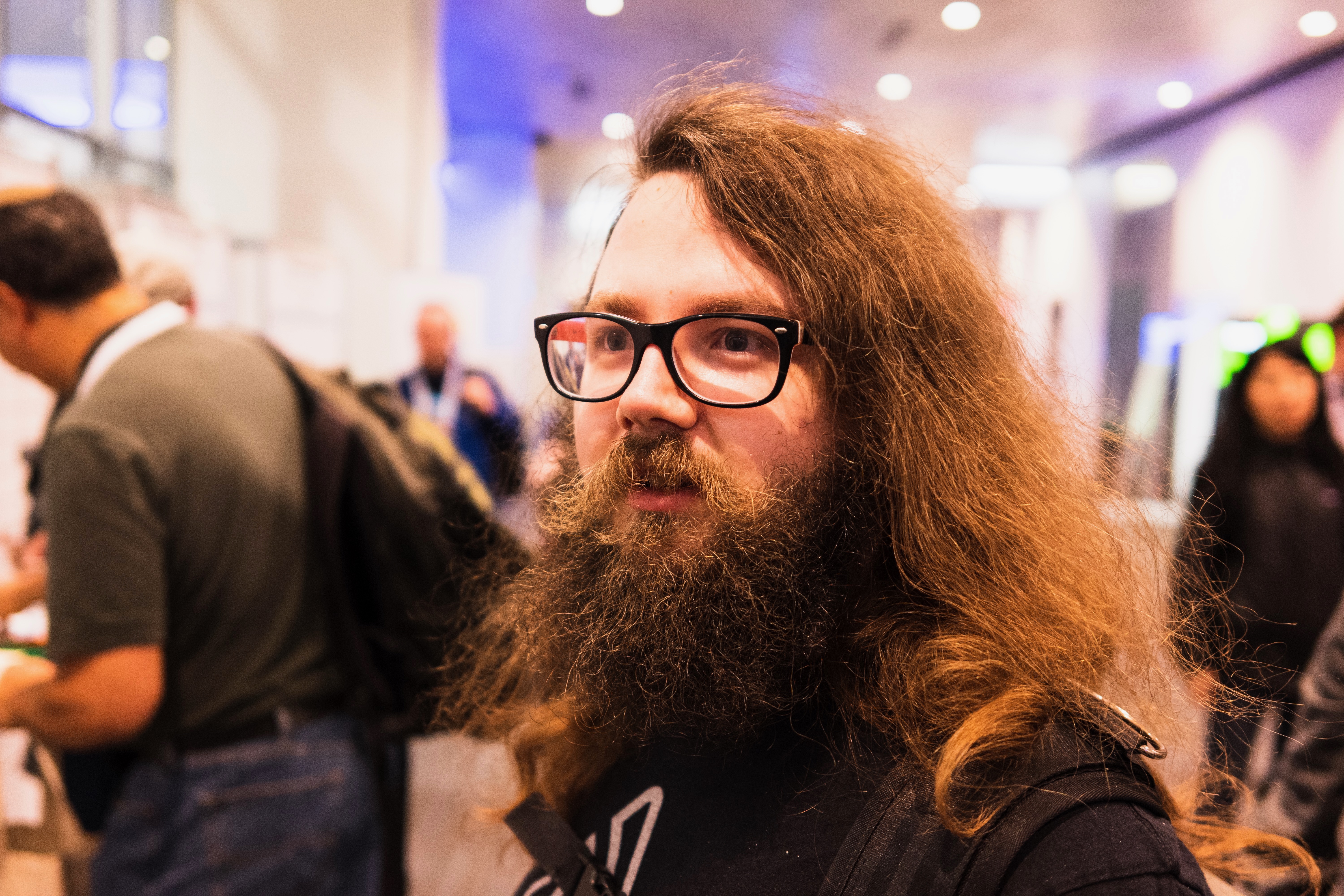 A thoughtful young man, adorned with a voluminous beard and tousled hair, gazes directly at the camera, creating an intimate connection with the viewer. The background is bustling with people, hinting at a lively event, while the soft, warm lighting enhances the candid ambiance. The contrast between the subject's focus and the blurred activity around him underscores a moment of personal contemplation in a dynamic environment.