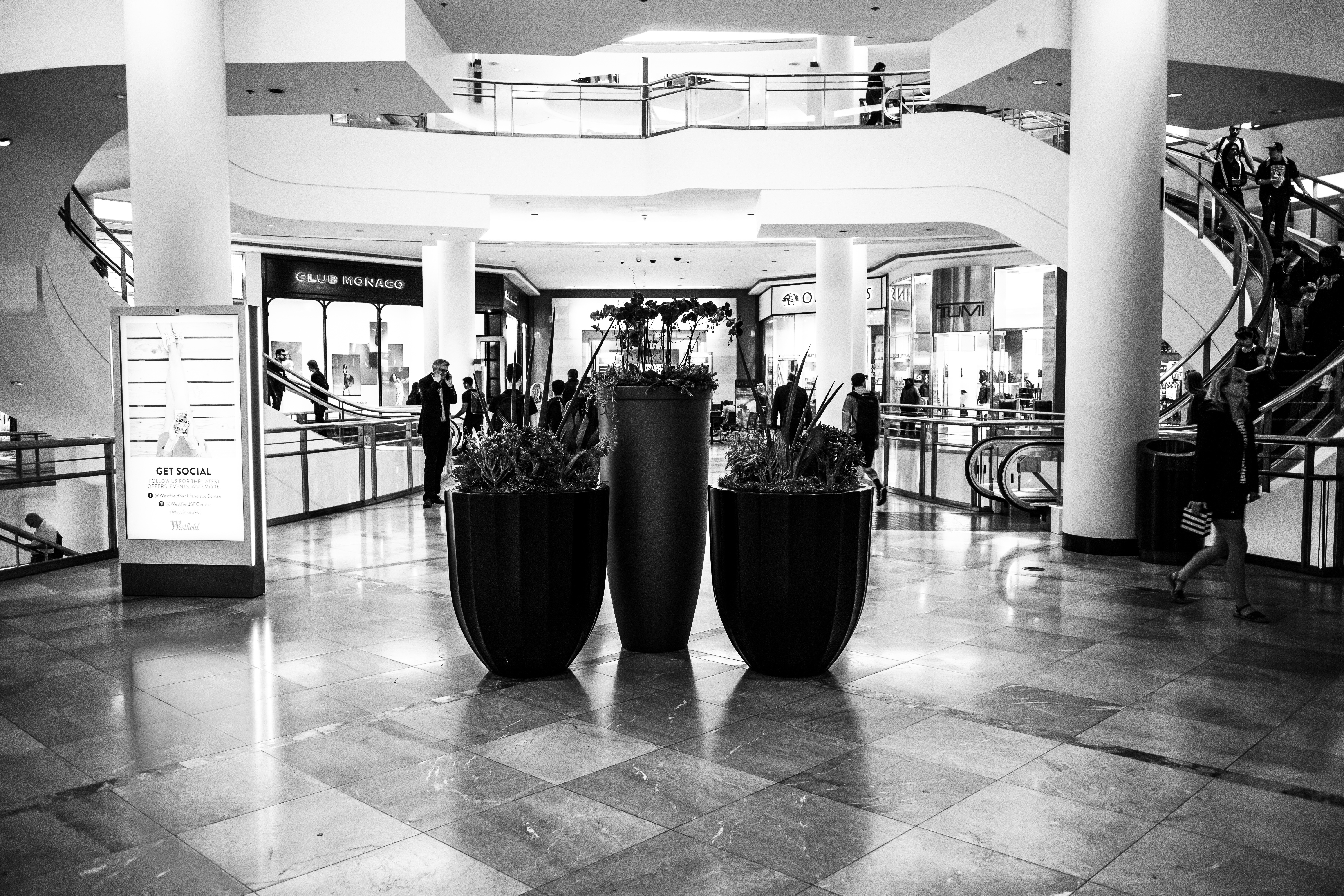 The photograph captures a spacious shopping mall, elegantly arranged in stark black and white. Large potted plants stand as focal points beneath a soft, diffused light, contrasting with the bustling crowd of shoppers moving through the space. The composition highlights the interplay between structure and nature, evoking a tranquil yet vibrant urban atmosphere.