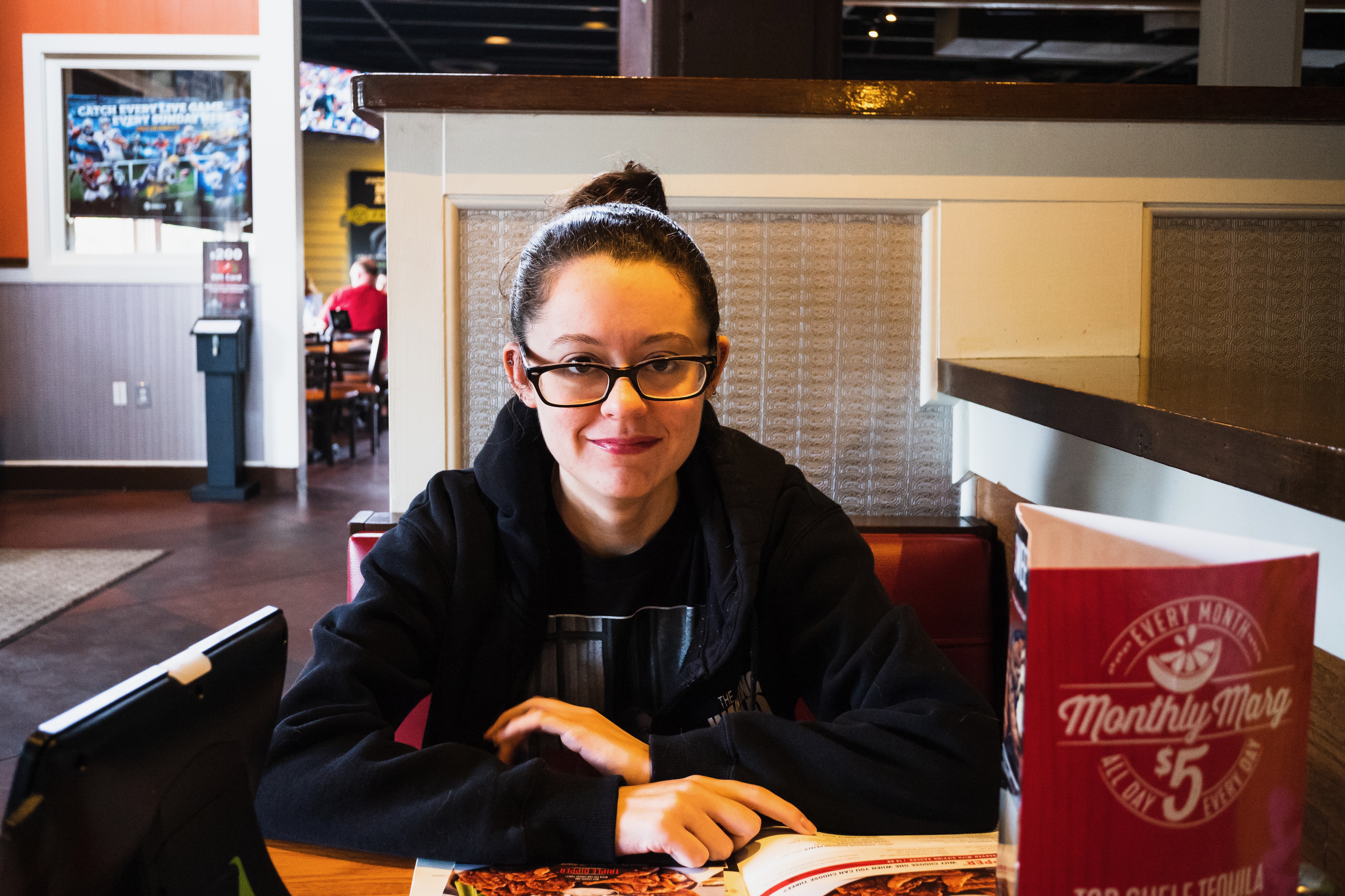 In this cozy restaurant setting, a young woman sits at a table, her expression warm and inviting. The bright overhead lighting highlights her features, contrasting with the soft, muted colors of the surroundings, creating an intimate atmosphere perfect for social gatherings.