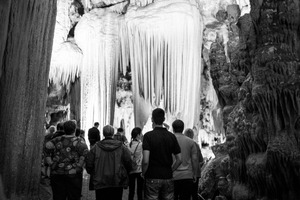 In a dimly-lit cave, a group of people gazes in awe at towering stalactites and stalagmites illuminated by soft, ethereal lighting. The monochrome tones heighten a sense of mystery and wonder, showcasing the dramatic contours of the rock formations against the silhouettes of the onlookers. The composition draws the eye upwards, creating a profound connection between the visitors and the ancient natural beauty surrounding them.