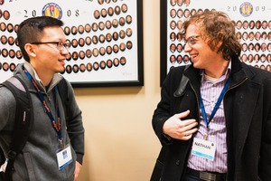 Two men engage in a light-hearted conversation, their expressions radiating warmth and camaraderie. The casual setting is punctuated by the contrasting formal photos in the background, and the soft, even lighting enhances the atmosphere of friendly interaction.