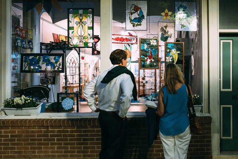 In a softly illuminated storefront, two figures lean in closely, captivated by the vibrant stained glass artworks on display. The warm ambient light creates a cozy, intimate atmosphere, enhancing the sense of wonder and shared discovery. Their postures and casual attire suggest a relaxed evening stroll, inviting viewers to imagine the dialogue unfolding between them.