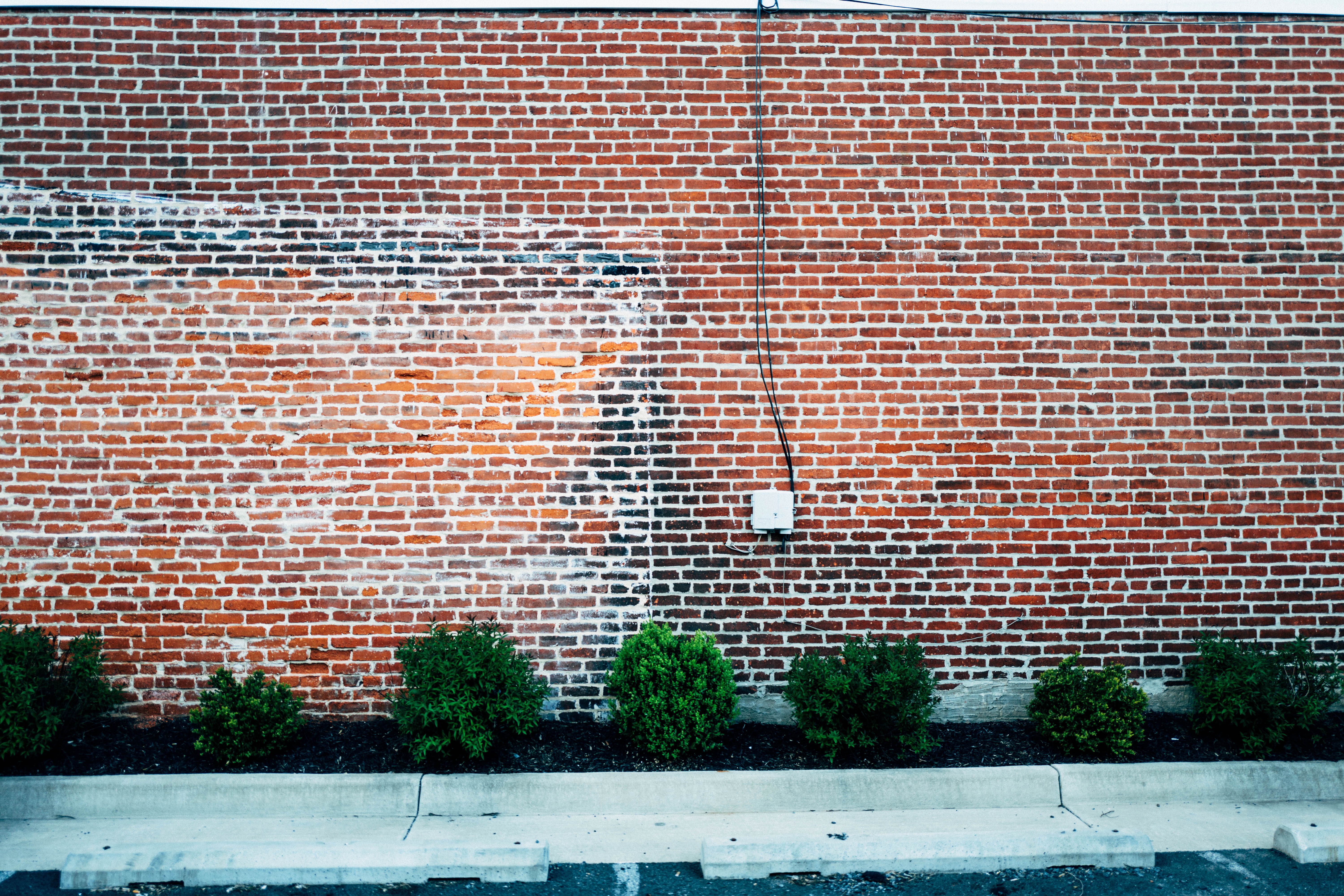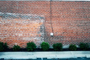 This photograph captures a textured brick wall adorned with a subtle patch of wear, contrasting with vibrant greenery below. The lighting lends a warm glow to the exposed bricks, creating a sense of depth and urban character. The composition balances the starkness of the wall with the soft, rounded shapes of the bushes, invoking a juxtaposition of resilience and nature.