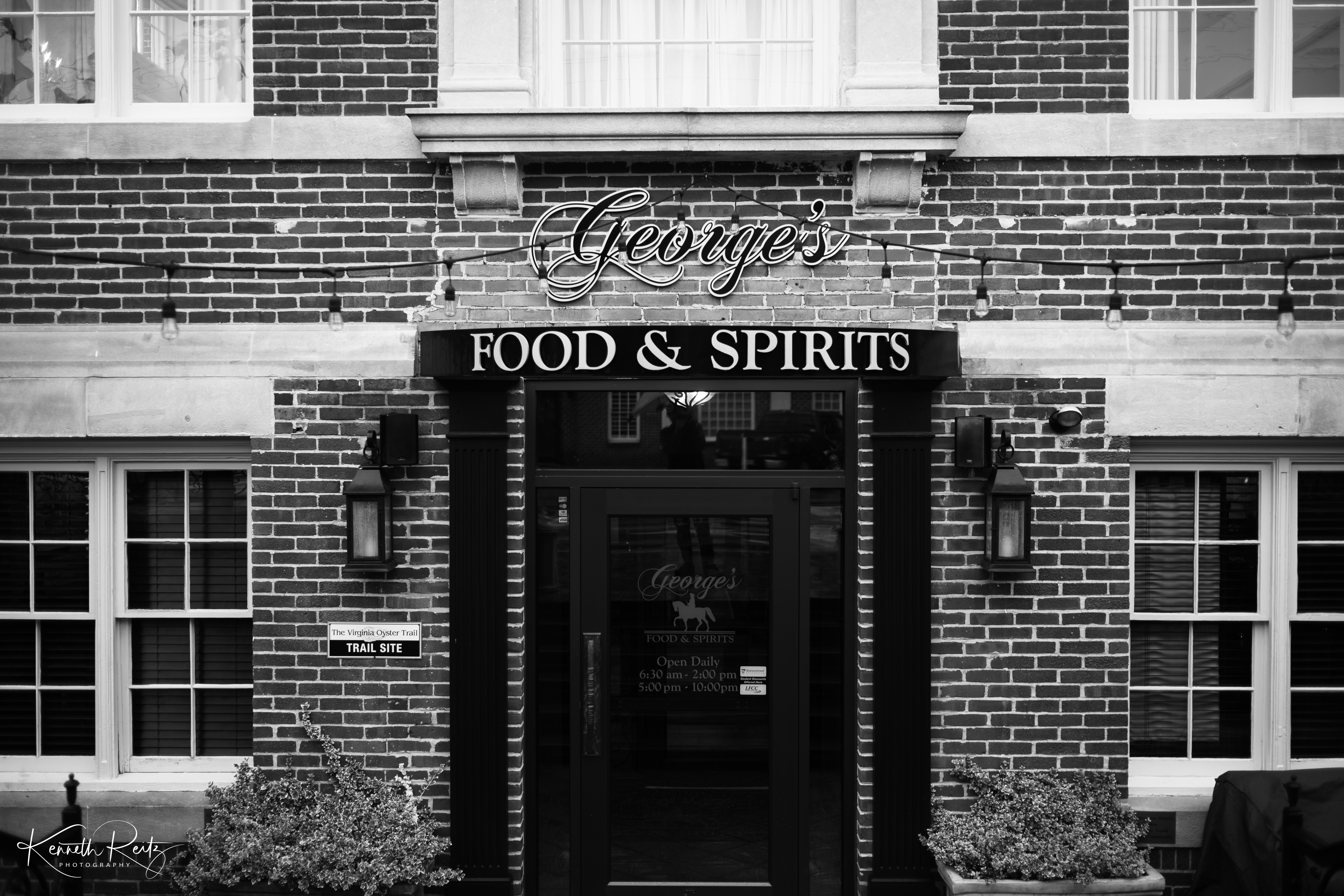 The photograph captures the inviting entrance of George's Food & Spirits, framed by warm brick tones and vintage-style signage. The black-and-white composition enhances a nostalgic feel, evoking memories of cozy gatherings and lively conversations. Gentle lighting from the sconces casts a welcoming glow, highlighting the establishment's charm.