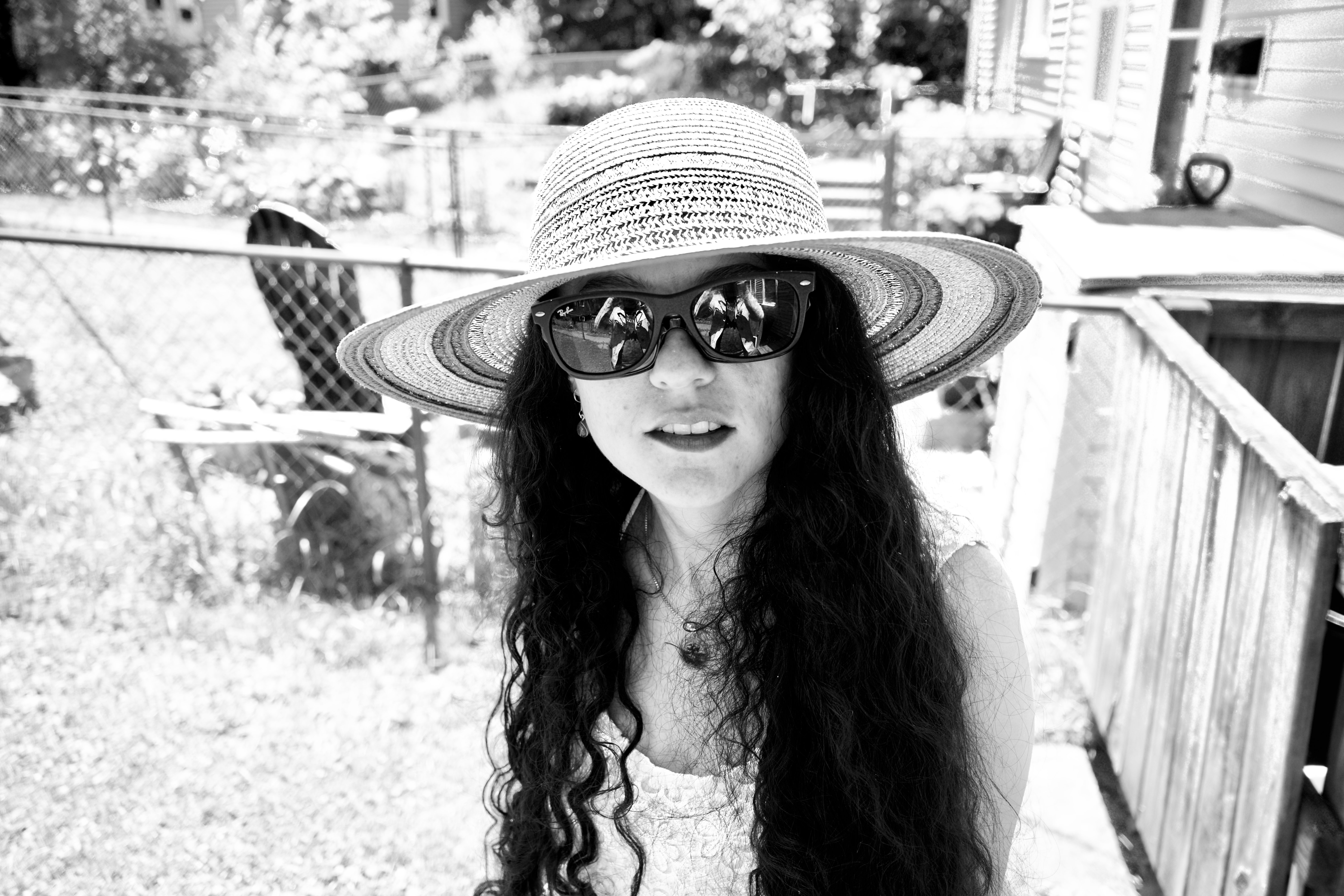 In this striking black-and-white image, a young woman with long, curly hair gazes directly at the camera, exuding a blend of confidence and curiosity. Her wide-brimmed hat and dark sunglasses give her an air of mystery, while the soft sunlight creates a dreamy atmosphere. The background is softly blurred, hinting at a lush garden and a warm day, enhancing the tranquil yet engaging mood of the composition.