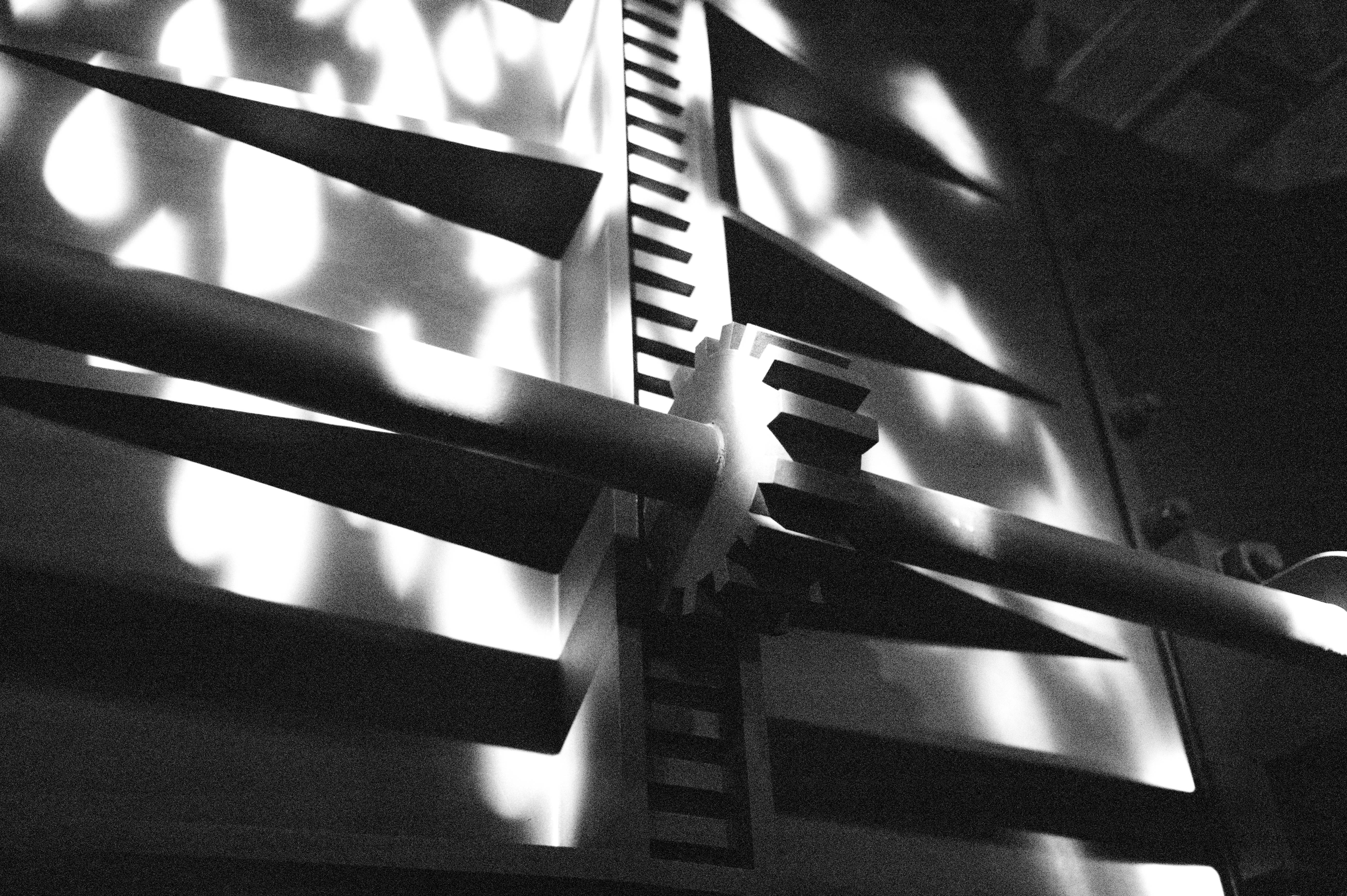 This striking black-and-white photograph captures the intricate details of mechanical components, featuring a gear and pipes casting dynamic shadows. The interplay of light and darkness creates a moody atmosphere, evoking a sense of industrial elegance and complexity. The composition emphasizes the textures and lines, inviting the viewer to explore the beauty in machinery.