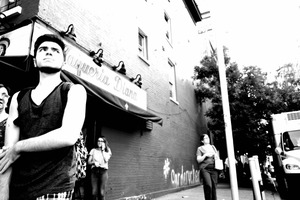 This photograph captures a bustling street scene, with a young man in the foreground displaying an expression of contemplation or determination. The contrasting light and shadow create a dynamic mood, emphasized by the monochrome palette, while the lively backdrop of pedestrians and the taqueria's signage adds depth and context to this urban narrative.