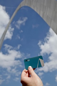A hand holds a stylized card against the backdrop of the monumental Gateway Arch, reaching gracefully into a bright blue sky dotted with fluffy white clouds. The contrasting colors and angles create a sense of adventure, inviting viewers to contemplate journeys both literal and symbolic. The clean composition emphasizes the elegance of the arch while maintaining focus on the personal and modern touch of the card.