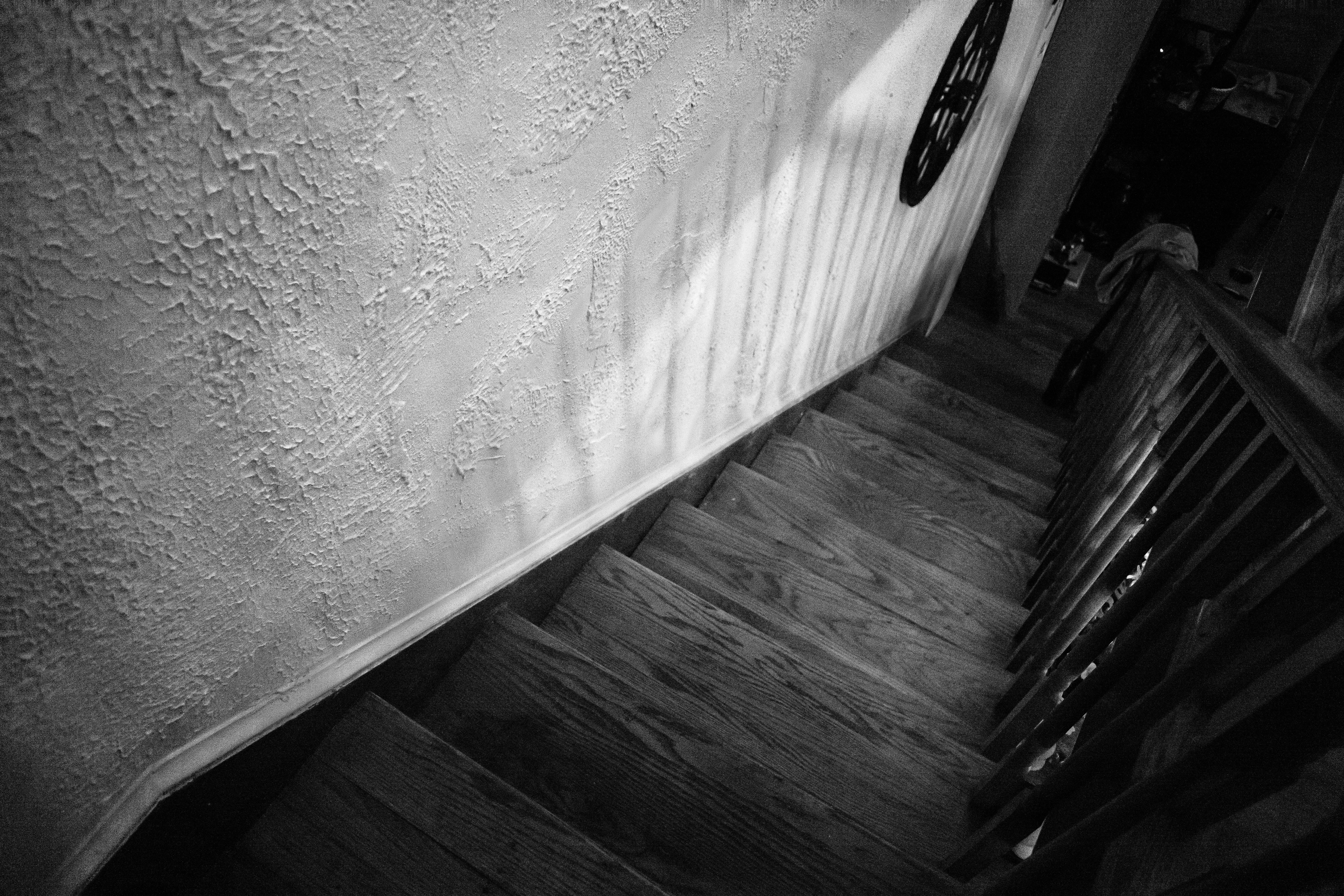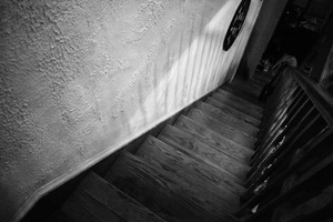 The photograph captures a downward perspective of a wooden staircase, inviting viewers into a moment of quiet introspection. Soft shadows dance against the textured wall, evoking a sense of mystery and nostalgia, while the monochrome palette enhances the stark contrasts between light and dark. The composition draws the eye along the steps, suggesting a journey deeper into the unknown.