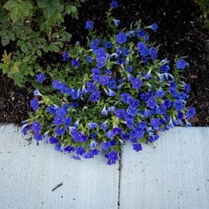 A lush patch of vibrant blue flowers contrasts beautifully against the stark gray concrete sidewalk. The soft green leaves around them add depth and texture, creating a serene and inviting mood. Natural light highlights the delicate petals, giving the scene a fresh and lively appearance.