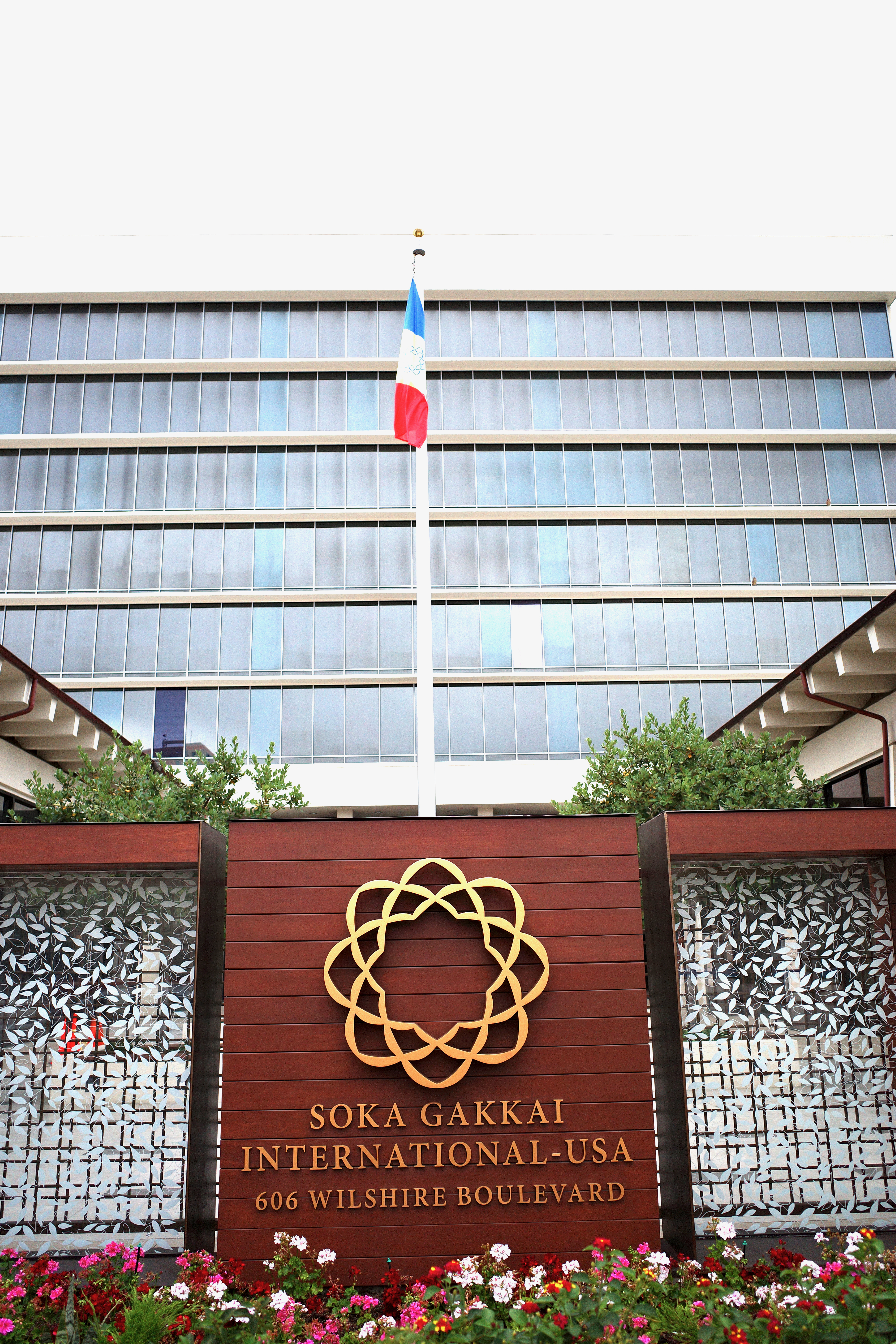 The photograph captures the entrance of Soka Gakkai International-USA, showcasing a prominent flag and a beautifully designed sign against a contemporary building backdrop. The clean lines and modern architecture reflect a sense of serenity, while the lush greenery and colorful flowers soften the composition, enhancing the inviting mood. Soft, diffused lighting adds to the overall tranquility, making this a peaceful urban setting.