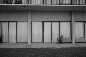 A stark black-and-white image captures a row of simple hotel rooms, their glass doors edged with flowing white curtains. A solitary plastic chair stands outside, casting a long shadow on the concrete, evoking a mood of isolation and quiet reflection. The minimalistic composition highlights the emptiness of the scene, inviting contemplation about the stories behind those closed doors.