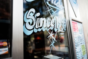 This photograph captures a close-up of a vintage window painting, prominently featuring the word 'Since' alongside a stylized date. The soft lighting and reflections create a sense of warmth and nostalgia, inviting viewers to reminisce about the past. The composition, focused on the intricate lettering, juxtaposes the vibrant colors against the subdued background, adding depth and interest.