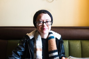 In a cozy cafe setting, a young woman sits comfortably in her seat, embodying warmth with a gentle smile. The soft light spills over her, highlighting her features and the textures of her scarf and jacket, while the inviting background exudes a relaxed atmosphere. The composition draws the viewer's eye to her expression, creating an intimate and welcoming mood.