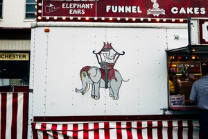 The photograph captures a charming scene of a fairground food stall, adorned with a playful painted elephant and clown motif. The warm, ambient lighting from the bulbs contrasts beautifully with the vibrant red and white stripes, creating a nostalgic, festive atmosphere. This composition evokes a sense of joy and whimsy, inviting viewers to reminisce about the delights of a carnival experience.