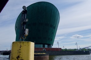 The photograph captures a striking green building with a unique, curved design, set against a serene cloudy sky. The juxtaposition of the building’s modern aesthetics and the calm waters creates a contemplative mood, inviting viewers to appreciate the blend of nature and architecture. A yellow dock post in the foreground adds a pop of color and depth to the composition, guiding the eye towards the impressive structure.