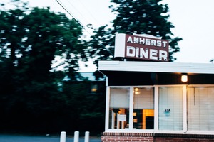 The photograph captures the Amherst Diner, a nostalgic eatery, bathed in the soft glow of evening light. The muted colors and slight blur evoke a sense of calmness, hinting at the end of a day and the anticipation of warm meals and cozy conversations inside. Surrounded by lush greenery, the scene feels both inviting and tranquil, inviting passersby to pause and linger.