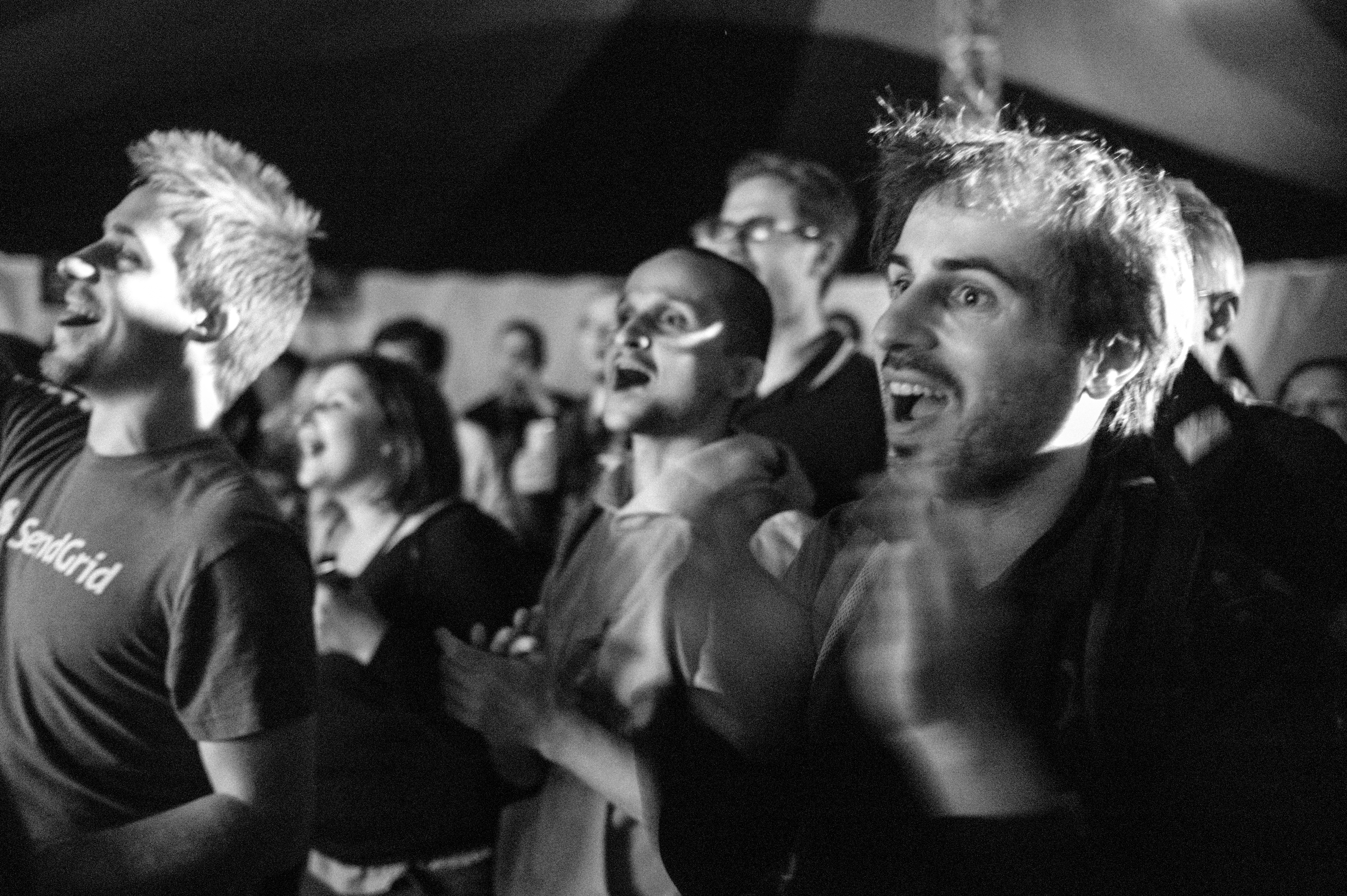 The photograph captures a moment of pure joy and excitement, showcasing a group of spectators illuminated by soft, dramatic lighting. Their animated expressions and enthusiastic gestures create an infectious atmosphere, inviting the viewer to feel the pulsating energy of the crowd. The starkness of the black-and-white composition intensifies the emotional intensity, emphasizing the collective experience of celebration.