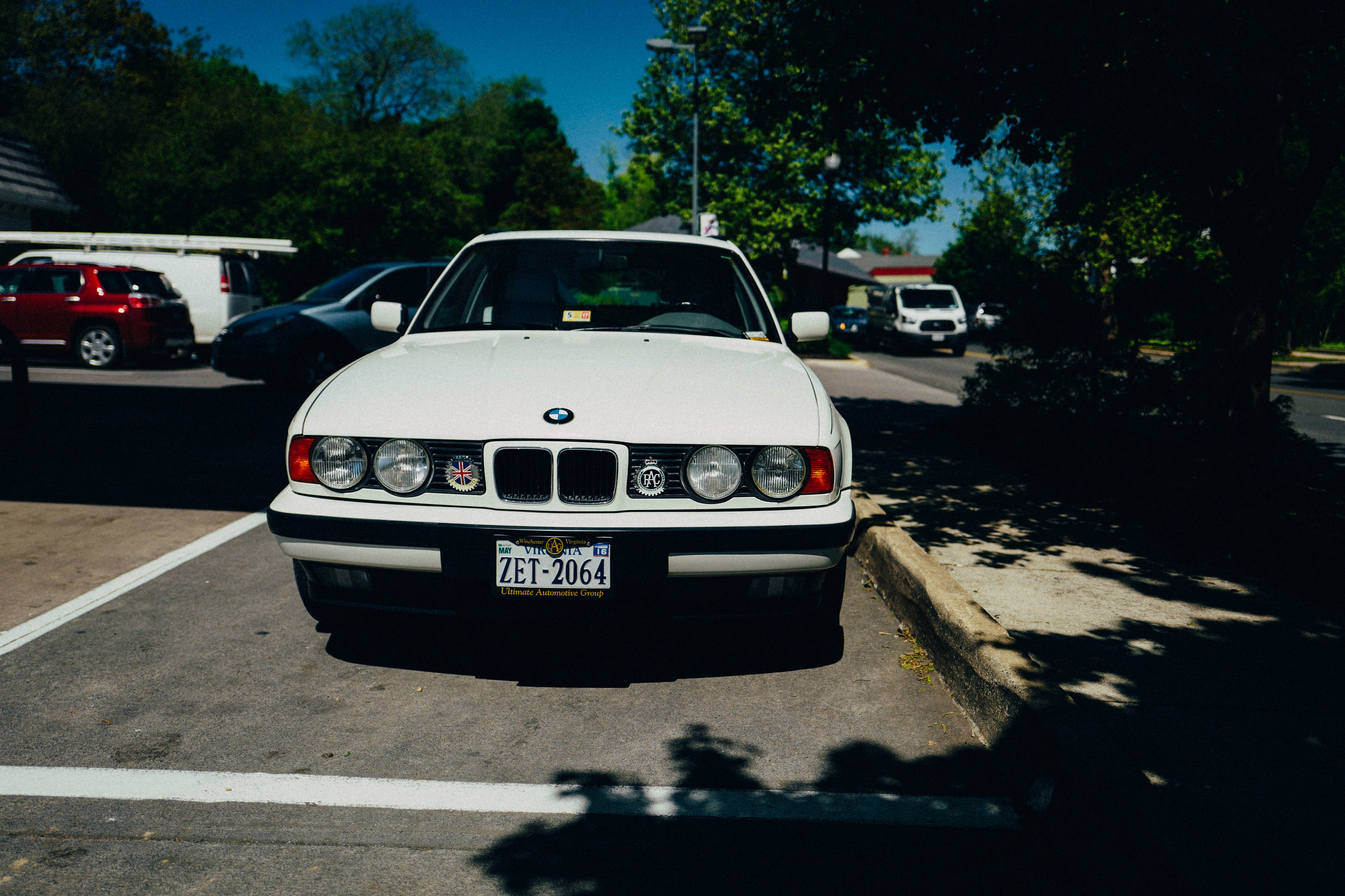 A vintage white BMW stands prominently in a parking lot, capturing attention with its sleek lines and classic design. Bathed in bright sunlight, the scene radiates a nostalgic yet vibrant energy, enhanced by the lush greenery in the background. The composition draws the eye to the vehicle's front, creating a sense of admiration and timeless style.