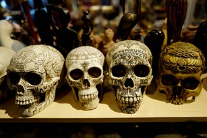 A trio of intricately decorated skulls sit prominently on a soft-lit shelf, each showcasing unique patterns and engravings that celebrate the artistry of life and death. The warm, inviting light casts gentle shadows, enhancing the textures and details of the bone-like surfaces. The overall mood blends an appreciation for craftsmanship with a thoughtful reflection on mortality.