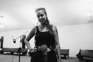 A striking portrait captures a young woman standing confidently, adorned in a flowing black dress with a decorative belt. The soft lighting and high contrast emphasize her features while the spacious, sparsely furnished background creates a sense of solitude, enhancing the contemplative mood of the image.