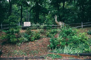 Nestled among lush greenery, a whimsical dinosaur figurine peeks through the dense foliage, adding a touch of nostalgia and playfulness to the scene. The wooden fence and sign directing visitors to the miniature train ride invites exploration, while soft, diffused lighting creates a calm, enchanting atmosphere. The harmonious blend of nature and imagination evokes a sense of childlike wonder.