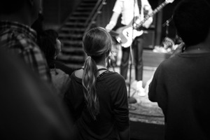 A young woman stands at the forefront, her back turned to the viewer, absorbed in the live music unfolding before her. The monochrome tones create a nostalgic and intimate atmosphere, capturing the electric energy of the performance and the connection between the audience and the stage. The soft focus on the crowd contrasts with the sharp presence of the performer, emphasizing the moment's depth and excitement.