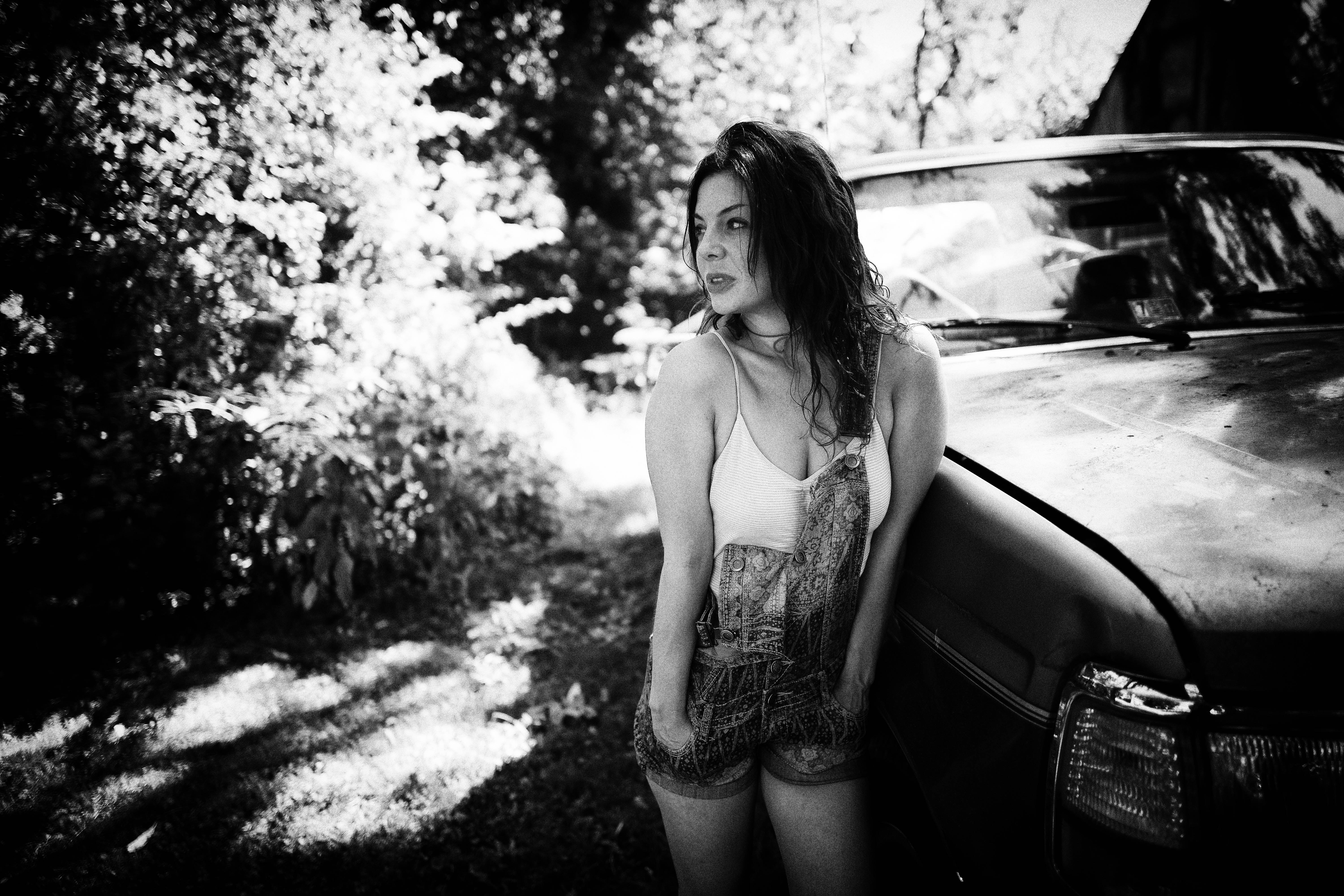 A young woman poses with a relaxed confidence beside an old vehicle, her attire hinting at a carefree summer vibe. The black-and-white tones create a nostalgic atmosphere, while dappled light filters through the surrounding foliage, casting soft shadows that enhance the intimate mood. The composition balances the subject with the rustic environment, inviting a sense of story and reflection.