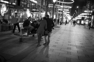 A group of friends congregates on a bench, immersed in lively conversation under the soft glow of urban lights. The black-and-white composition lends a nostalgic feel, while the scattered figures and ambient lighting suggest a bustling yet intimate nighttime atmosphere. Shadows dance across the pavement, adding depth and mood to this candid urban scene.