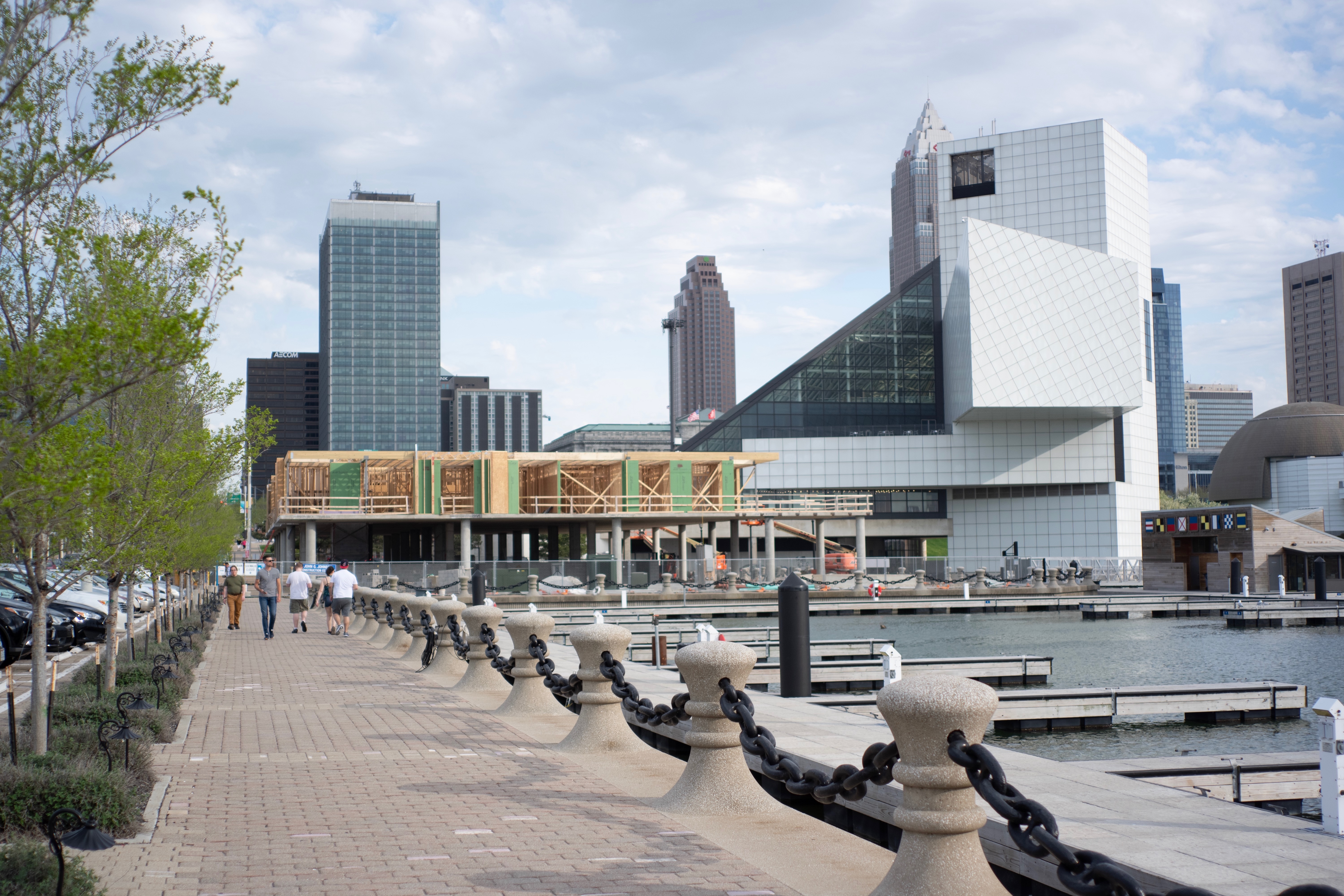 This photograph captures a vibrant waterfront scene, where a modern architectural marvel stands adjacent to ongoing construction. Soft, natural lighting casts gentle shadows, creating an inviting mood as pedestrians stroll along the walkway. The contrast between the sleek buildings and the serene water enhances the dynamic urban landscape, showcasing both progress and tranquility.