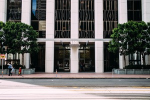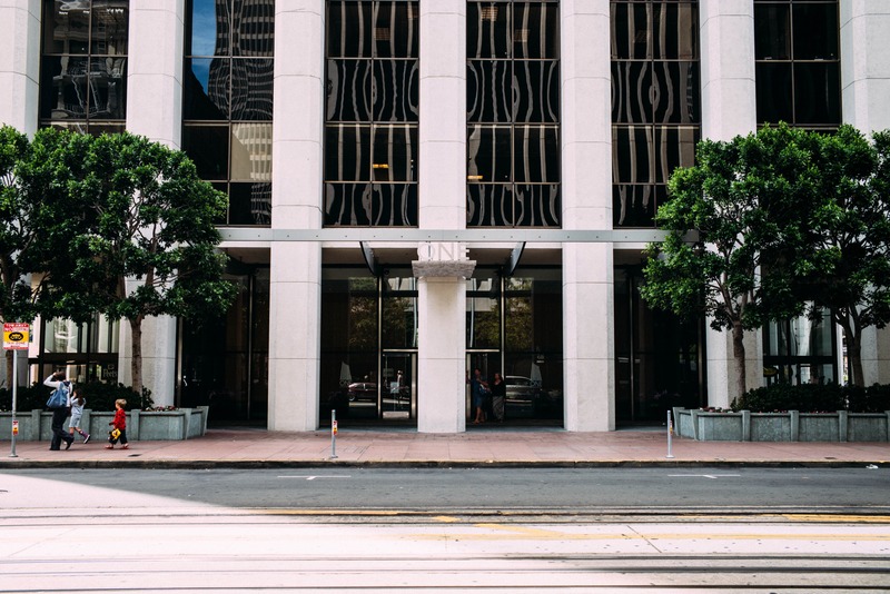 This photograph captures a sleek, modern building framed by lush greenery, evoking a sense of urban tranquility. The interplay of light and shadow creates a calm yet vibrant atmosphere, inviting viewers to explore the depth of the architecture. People's silhouettes add life to the scene, enhancing the mood of a busy city afternoon.