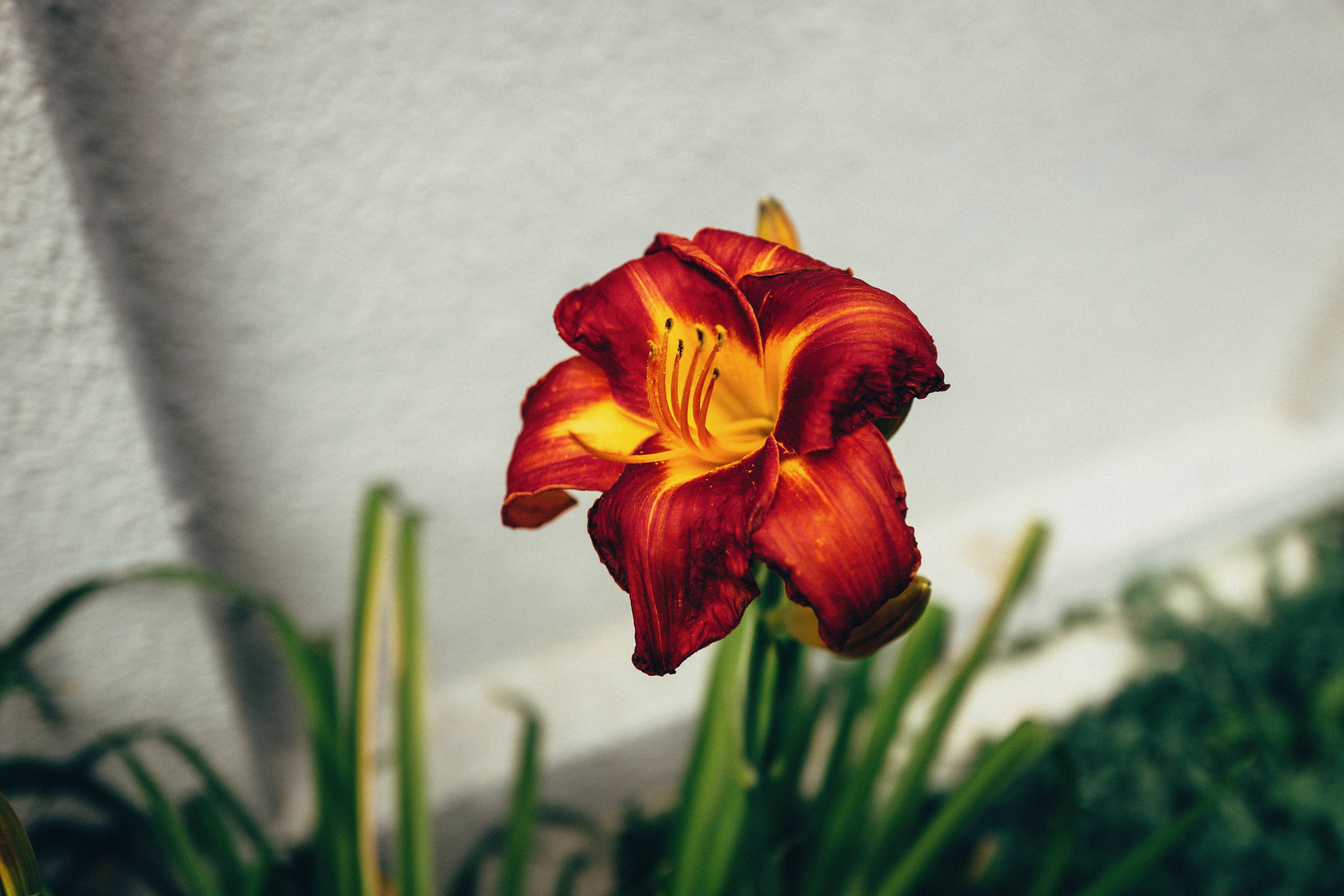 A striking red and orange flower blooms vividly against a muted, light-colored backdrop. The composition highlights the flower’s elegant curves and intricate details, evoking warmth and vitality. Soft lighting enhances the rich colors, creating a serene yet vibrant mood that draws the eye in.