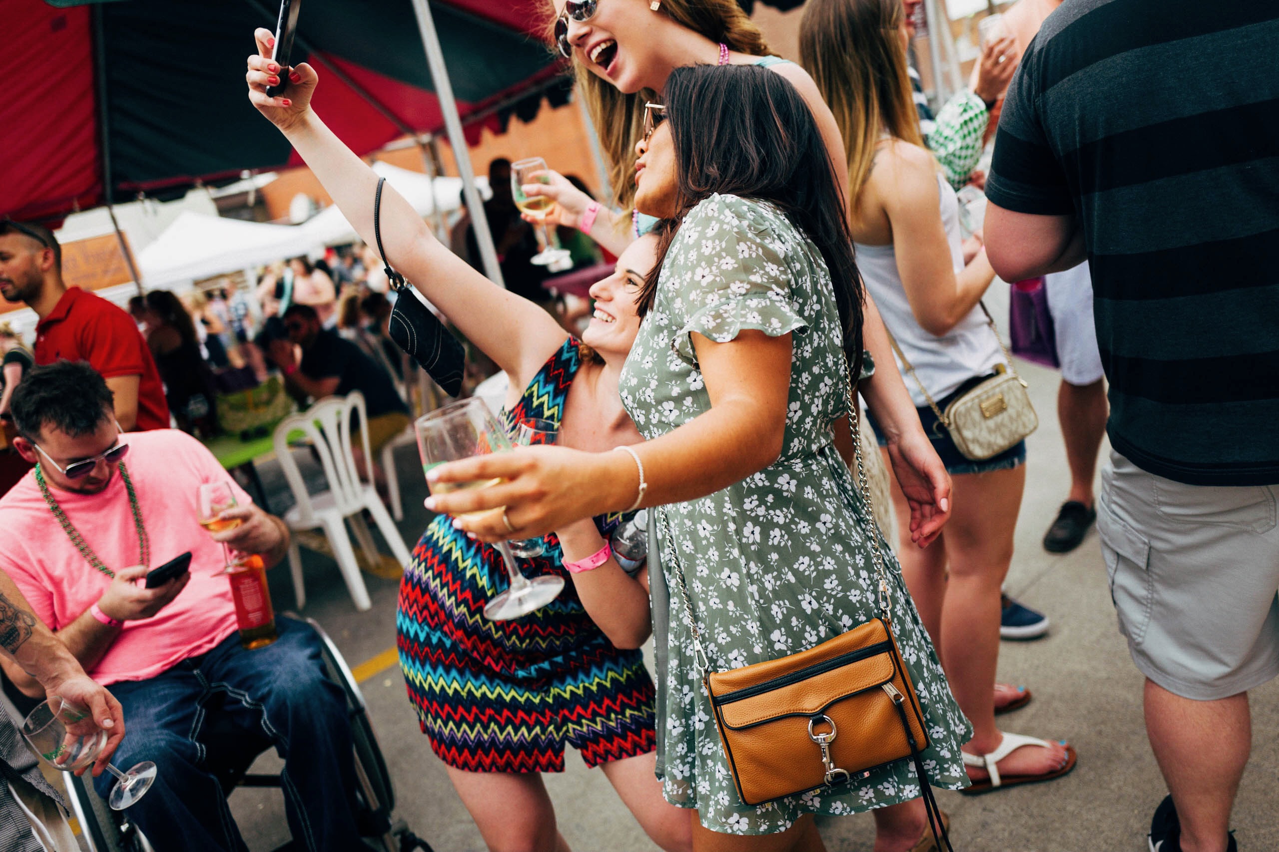 This vibrant photograph captures a trio of friends taking a joyful selfie amidst a lively outdoor gathering. The bright, natural light illuminates their genuine smiles and playful expressions, creating an atmosphere of carefree celebration. With colorful outfits and a backdrop of blurred festival-goers, the scene radiates fun and camaraderie.