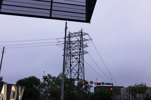 A looming power line tower dominates the skyline, framed by a muted, overcast sky that casts a somber mood over the scene. The composition is anchored by illuminated traffic signals and the reflective surface of a nearby structure, creating a juxtaposition of urban life against industrial elements. The soft lighting evokes a sense of stillness, hinting at an impending transition from day to night.