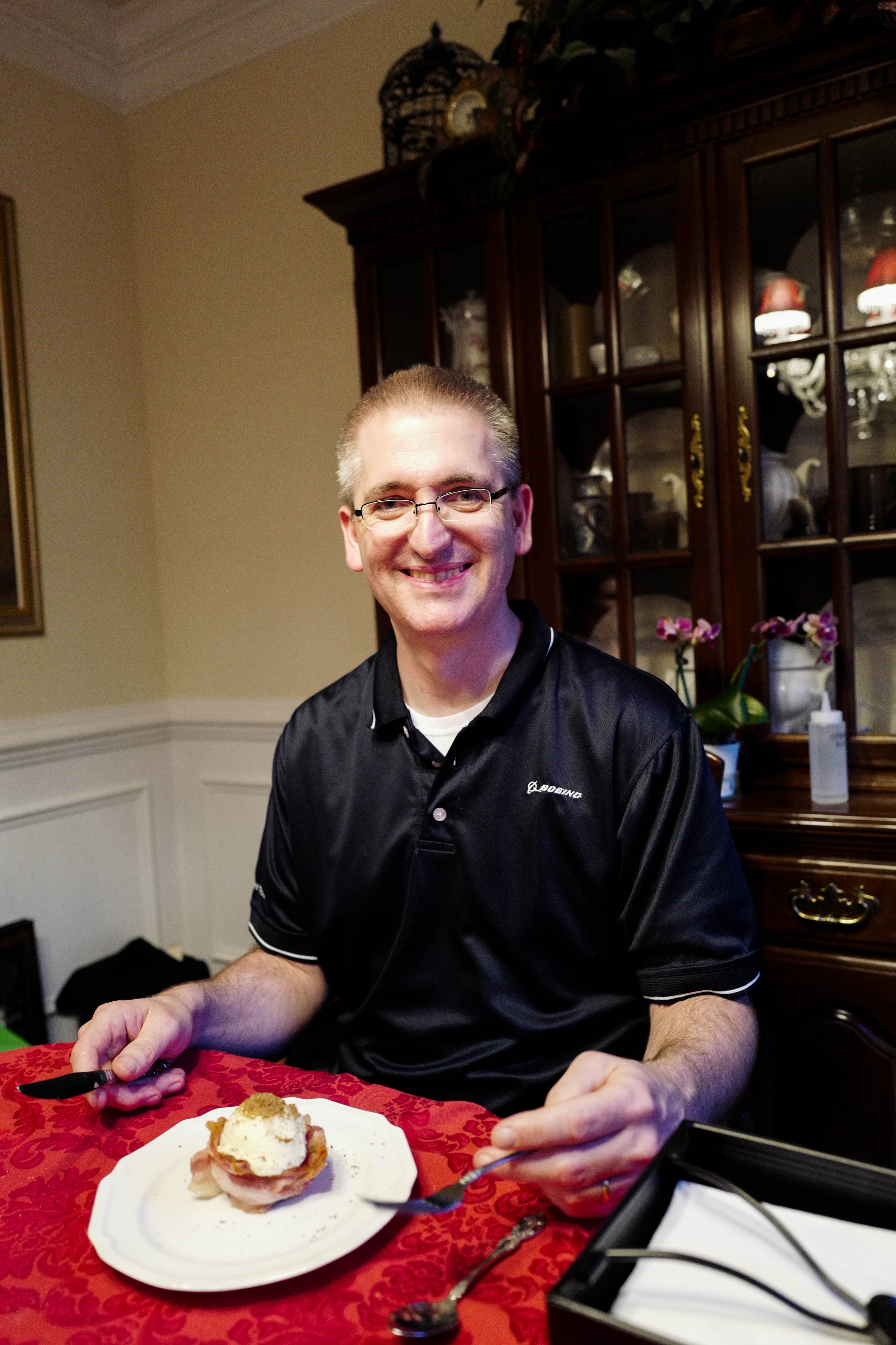 The photograph captures a man at a dining table, grinning broadly as he engages with his meal. The warm lighting enhances the inviting atmosphere, while the rich red tablecloth and glassware in the background add a touch of elegance. His cheerful demeanor reflects a moment of enjoyment and comfort, making it a cozy scene of shared happiness.