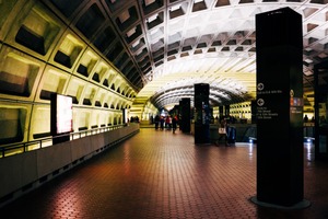 This photograph captures the expansive interior of a subway station, showcasing its geometric architecture highlighted by warm lighting. The ambient glow creates a welcoming yet slightly mysterious atmosphere, while figures move along the spacious corridor, emphasizing the station's role as a transit hub. The contrast of light and shadow enhances the intriguing design of the ceiling, drawing the eye along the length of the platform.