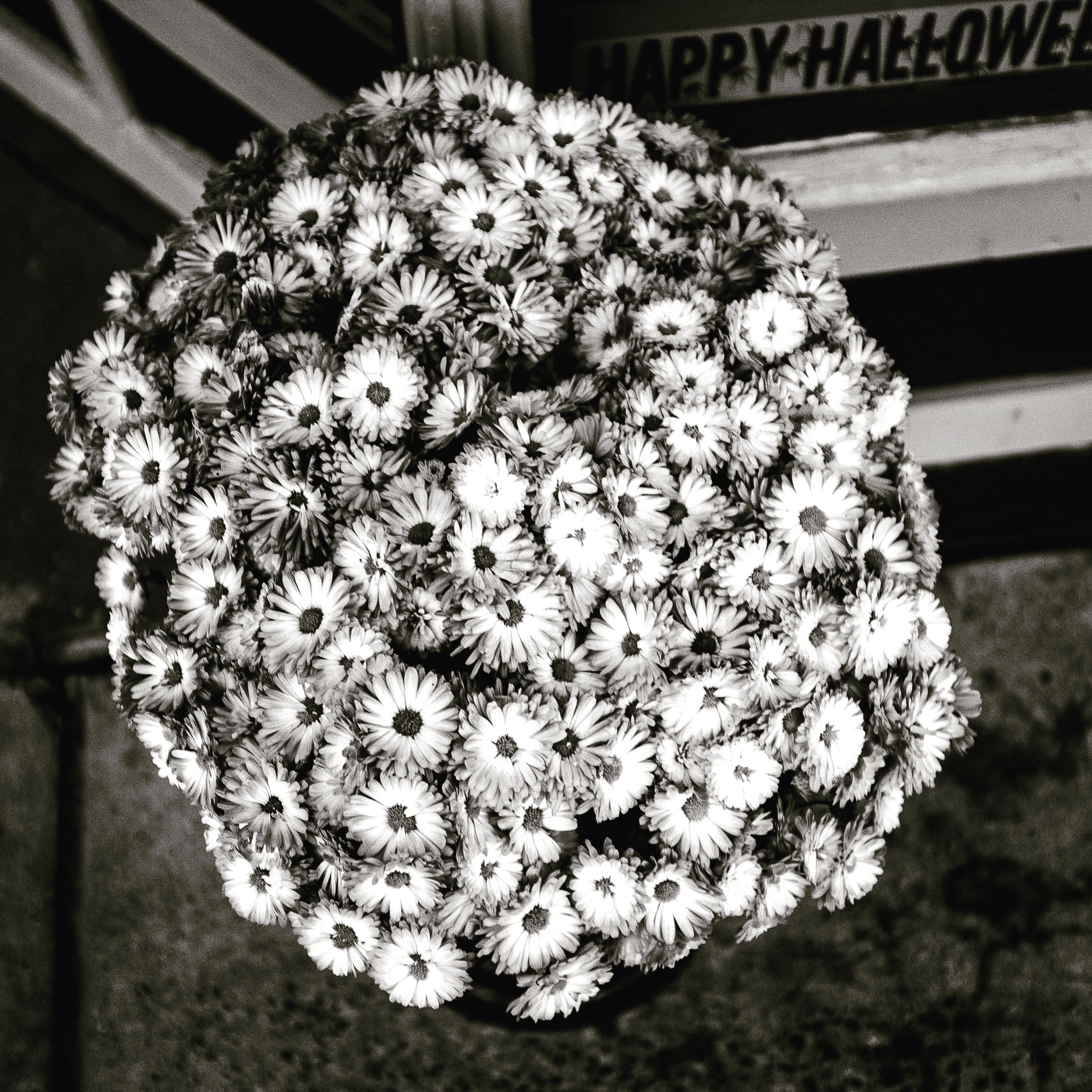 A vibrant bouquet of daisies fills the frame, their forms richly detailed against a soft, blurred background. The black and white treatment emphasizes texture and contrast, evoking a nostalgic and serene mood. The composition draws the eye inward, creating an intimate connection with the natural beauty of the flowers amidst an autumnal hint in the surrounding ambiance.