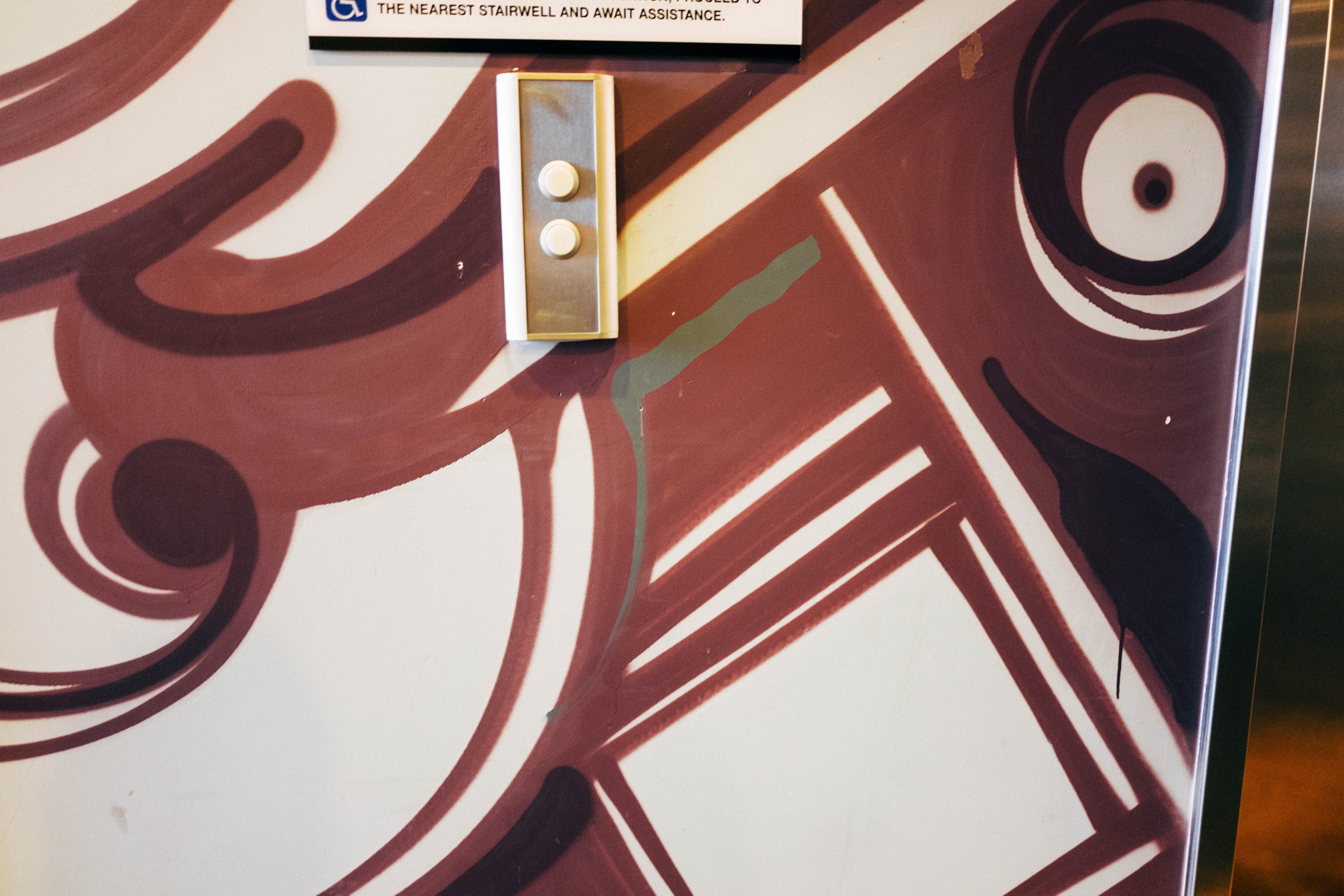 The photograph captures an elevator wall adorned with abstract, swirly brown patterns, creating a dynamic and urban feel. A pair of buttons and a sign add an element of functionality, contrasting with the artistic backdrop. Soft lighting enhances the warm tones of the mural, evoking a sense of casual exploration in a modern space.