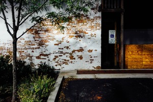 This photograph captures a quiet urban scene at night, featuring a textured wall of weathered bricks illuminated by soft lighting. The contrast between the rustic, peeling paint and the nearby dark asphalt creates a moody atmosphere, while the foliage adds a touch of life. A reserved parking sign subtly hints at the human presence in this secluded space.