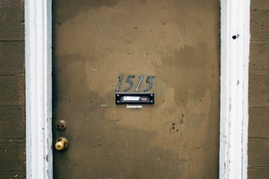 The photograph captures a worn brown door adorned with the number '1515' and a simple mail slot, encapsulating a sense of history and time's passage. The muted tones and subtle texture of the door evoke feelings of nostalgia and curiosity, inviting the viewer to ponder the stories held within. Soft, diffused lighting enhances the door's aged appearance, highlighting its imperfections and character.