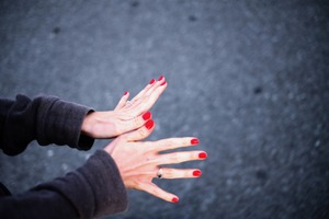 The photograph captures a moment of delicate hands poised gracefully against a muted grey background, emphasizing the striking contrast of vibrant red nails. Soft lighting enhances the intimacy of the scene, evoking a feeling of refined elegance and personal expression. The subtle focus on the hands suggests a story of connection, creativity, or contemplation.