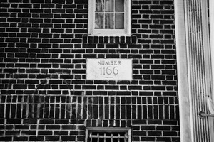 This monochrome photograph presents a close-up of a brick wall, featuring a faded plaque that reads 'NUMBER 1166.' The stark contrast between the rough texture of the dark bricks and the white plaque casts a somber mood, evoking a sense of history and quiet reflection.