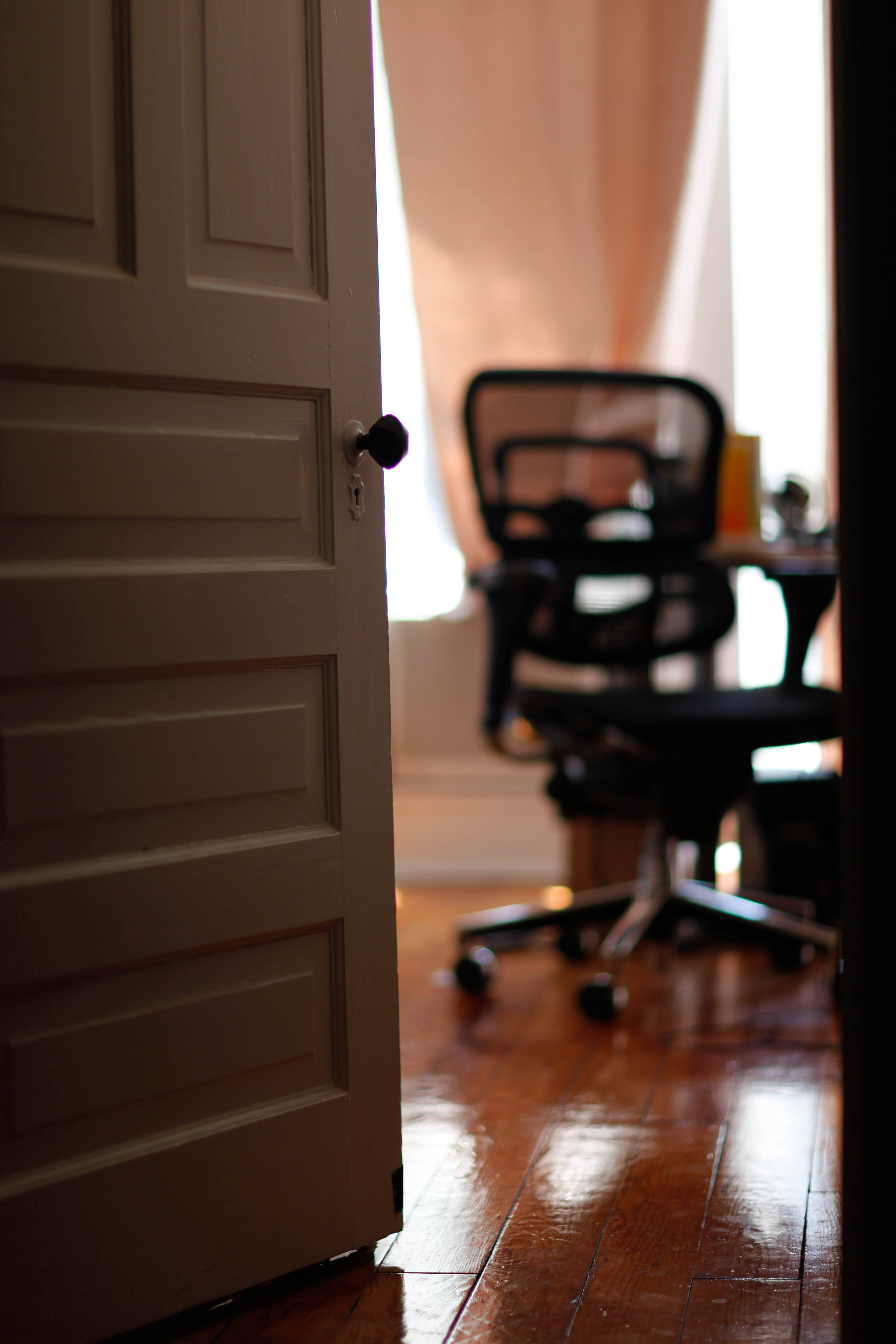 The photograph captures a partially open door, framing a glimpse into a softly lit room with a sleek office chair waiting in solitude. Warm, golden light spills across the polished wooden floor, enhancing the tranquil mood of the space. The gentle interplay of light and shadow invites contemplation, hinting at productivity and calm within.