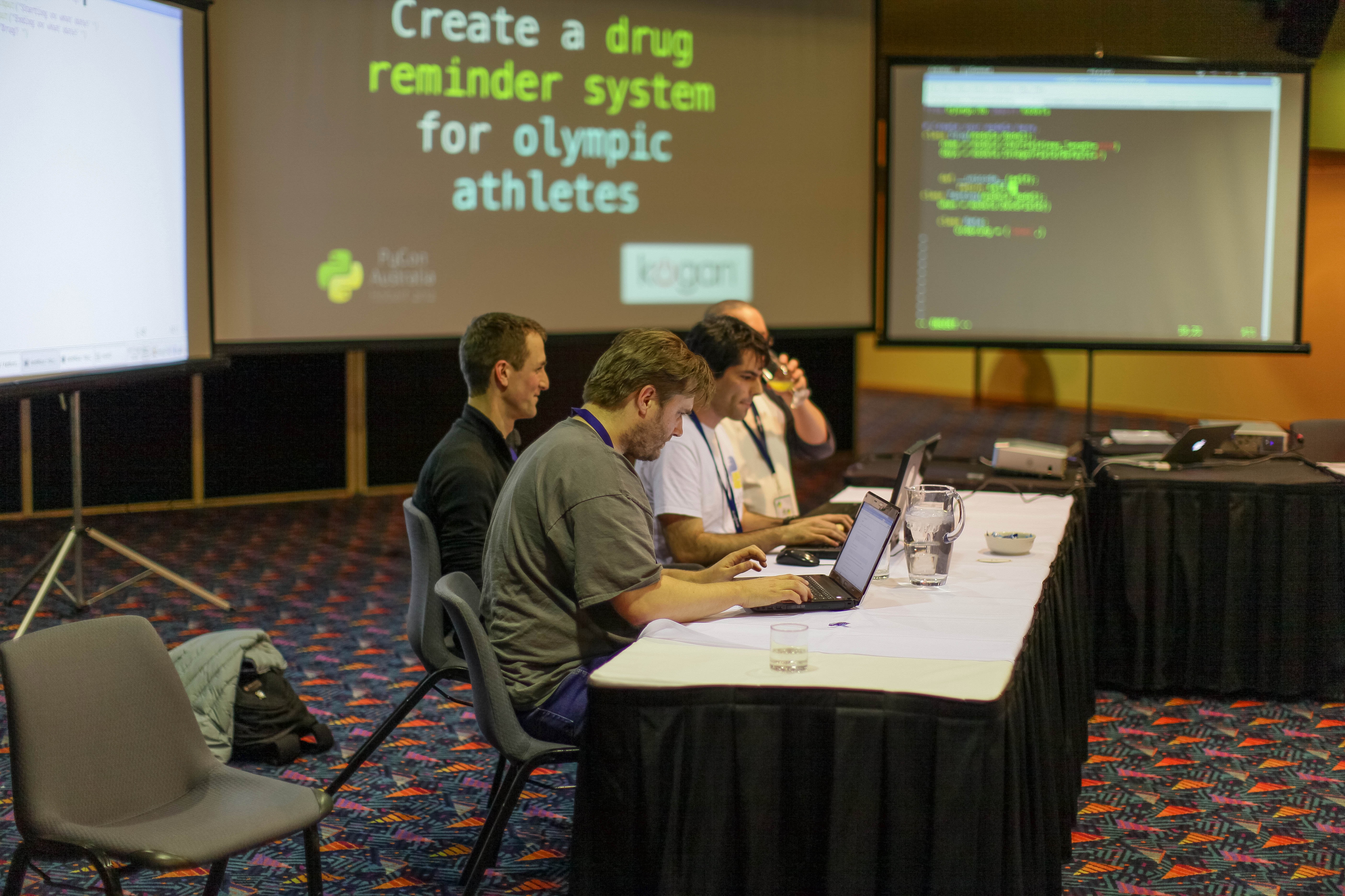 In a bright, modern conference room, four individuals sit focused at a table, surrounded by screens displaying code and project details. The intense atmosphere is highlighted by soft lighting, conveying a sense of teamwork and innovation as they engage in developing a drug reminder system for Olympic athletes.