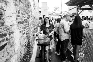 Amid a bustling outdoor scene, a cheerful woman rides her bicycle, exuding casual confidence and warmth. The narrow brick alleyway, highlighted by soft black and white tones, enhances the lively yet intimate atmosphere of the gathering. Subtle light captures her smile, inviting viewers into a moment of joy and connection in the heart of a vibrant community event.