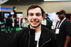 The photograph captures a young man with a bright smile, standing confidently in a bustling event space. Soft, diffused lighting enhances the warmth of his expression, while a blurred background hints at the lively atmosphere of the gathering. His casual attire and approachable demeanor evoke a sense of camaraderie and excitement.